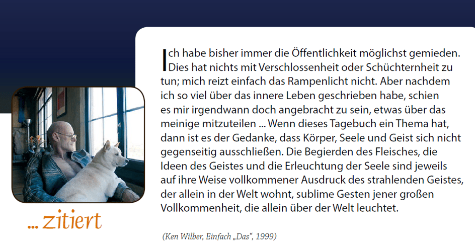 27. Januar: Ich (Jack Crittenden) habe Ken Wilber einmal gefragt, wie er selbst seine Arbeit sieht, und er antwortete mir: „Sie ist vielleicht eine der ersten glaub-würdigen weltumspannenden Philosophien, eine wirkliche Zusammenfassung von Ost und West, Nord und Süd.“ Ganz in diesem Sinne äusserte sich vor kurzem der bekannte Religionswissenschaftler Huston Smith: „Niemand, auch nicht Jung, hat so wie Wilber die westliche Psychologie für die überdauernden Einsichten der grossen Weisheitstraditionen der Welt sensibilisiert. Langsam, aber sicher, Buch um Buch, legt Wilber die Grundlagen einer echten west-östlichen Psychologie.“ (S. 31)